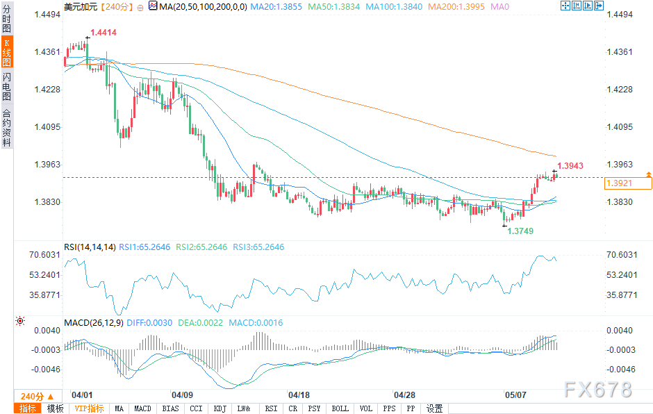 如果美元兑加元收于1.3950水平上方,将朝着下一个阻力位1.4060-1.4080运行。相对强弱指数(RSI)近期已进入超买区域,但短期内仍有足够空间进一步获得上涨动力。