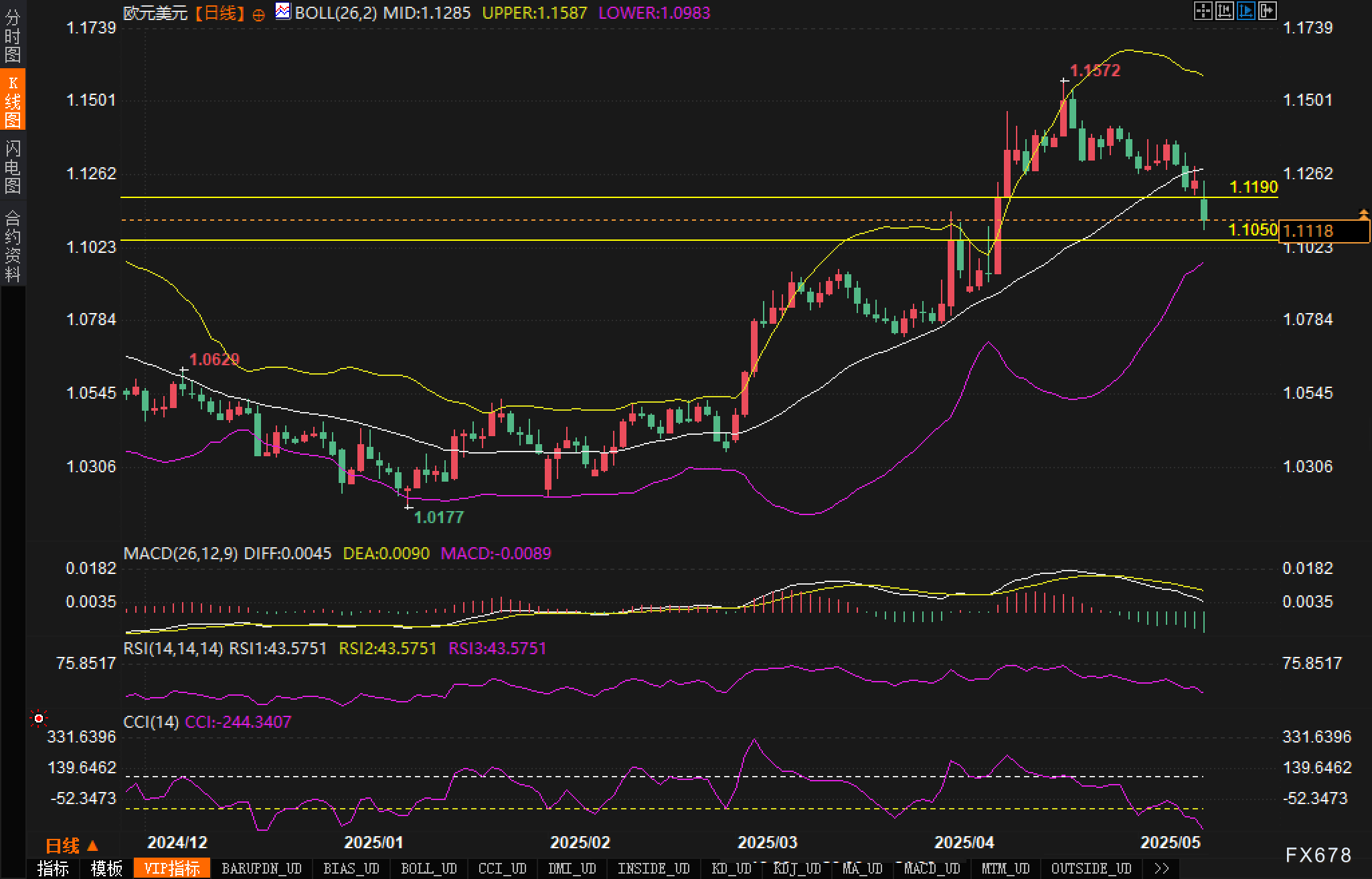 嘉盛——周一(5月12日),欧元/美元汇价日内跌破了1.120支撑位,欧洲时段徘徊在1.110附近。随着市场对全球谈判的关注加剧,交易员对汇价进一步下行的预期逐渐升温。分析师认为,尽管汇价自4月21日的高点回落约3%,但仍相对被高估,尤其是考虑到短期利差对美元的支撑。市场在等待有关贸易、宏观数据以及地缘政治进一步发展的消息。