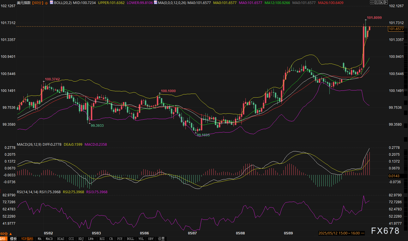 嘉盛——周一(5月12日),受中美贸易会谈联合声明推动,美元指数在亚洲时段迅速拉升,日内涨幅达1.20,报价攀升至101.6251,创下近三个月新高。这一突破性行情不仅反映市场对贸易摩擦缓和的积极定价,更揭示了技术面与基本面的共振效应。以下从多周期视角解析当前市场动能及未来潜在路径。
