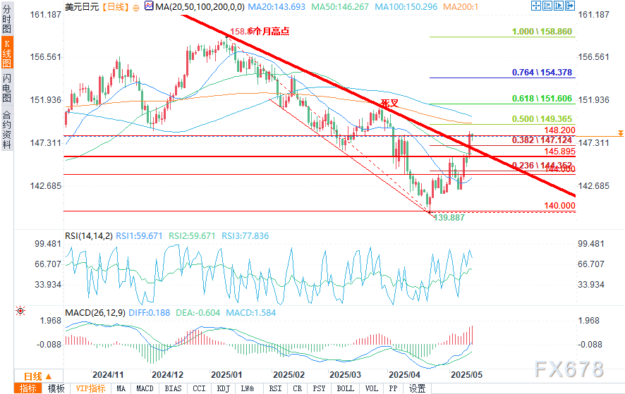 日线图上,美元兑日元上破了主要趋势线。昨日美中关税减免的情况好于预期,买家在突破时蜂拥而至,现在将目标锁定在151.00关口。短期策略可以利用147.50心理水平,或者148.13斐波那契水平,可以视为美元/日元看涨的潜在支撑。