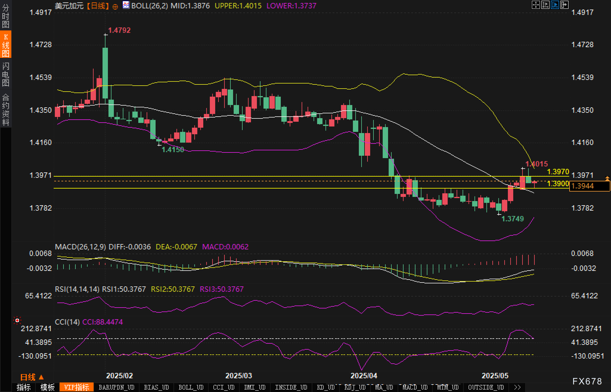 美元/加元汇价已连续第二日承压,当前交投于1.3950附近,维持在200日指数移动平均线下方。从日线图看,汇价自4月中旬以来形成明显下降趋势,突破多条支撑位。最近价格在1.3900-1.3970区间盘整,这一区域成为关键战场。