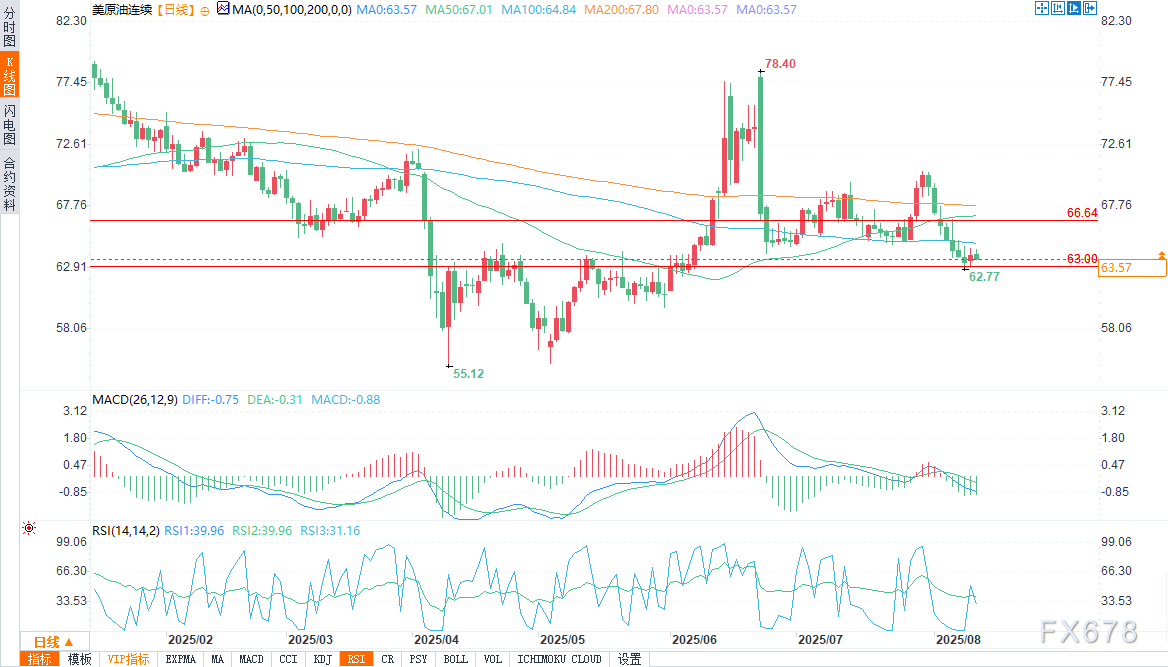 关税谈判为原油市场带来喘息之机   当前市场的平静部分源于中美关税的延长。中美决定将暂停加征关税的期限推迟至11月10日,这减轻了市场的一些压力。对中国商品征收三位数的关税本会对全球经济增长造成沉重打击,进而影响燃料需求。如今交易商获得了一点喘息空间——不过这究竟是走向实际协议的路径,还是只是拖延问题,仍有待观察。   降息预期提供额外支撑   另一个潜在的提振因素来自疲软的美国劳动力数据,这让交易商更倾向于美联储将在9月降息。此类举措往往会拉低美元汇率、推高股市,而且多数情况下会提振石油需求。今日晚些时候还将公布美国通胀数据——如果数据走弱,支持降息的呼声会更高。话虽如此,除非关键图表点位被突破,否则仅靠这一因素原油价格不会出现突破。   地缘政治可能迅速改写市场走势   交易商不能忽视周五特朗普与普京计划在阿拉斯加举行的会晤。俄乌冲突的头条新闻风险仍然很大——推动和平可能会缓解制裁压力,而谈判破裂则可能意味着对印度等俄罗斯石油买家实施更严厉的惩罚。德国商业银行已经警告称,如果周五的会晤没有取得进展,次级制裁可能会扩大。这类事件无论图表走势如何,都可能在一夜之间导致油价暴涨或暴跌。   前景展望:目前更有可能维持区间波动