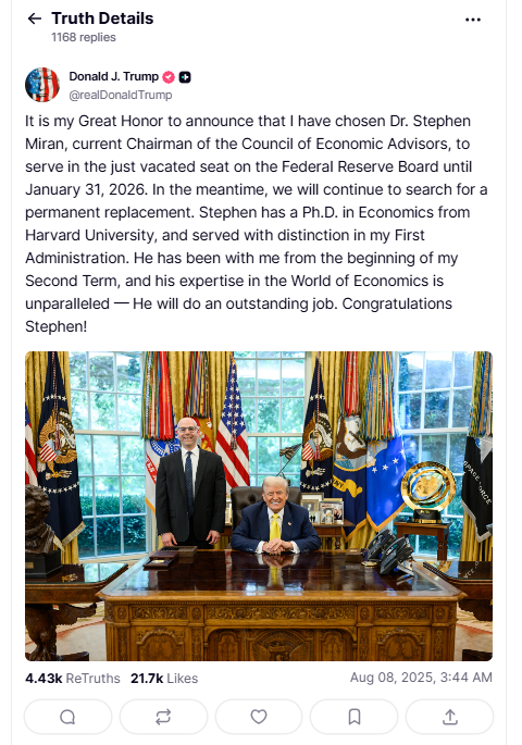 嘉盛平台:降息稳了?特朗普提名“他”出任美联储临时理事 或能赶上9月议息会议!